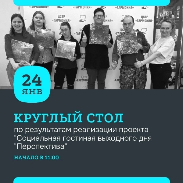 АНО «Центр социально-трудовой реабилитации «Гармония»приглашает принять участие в круглом столе по результатам реализации проекта «Социальная гостиная выходного дня«Перспектива».